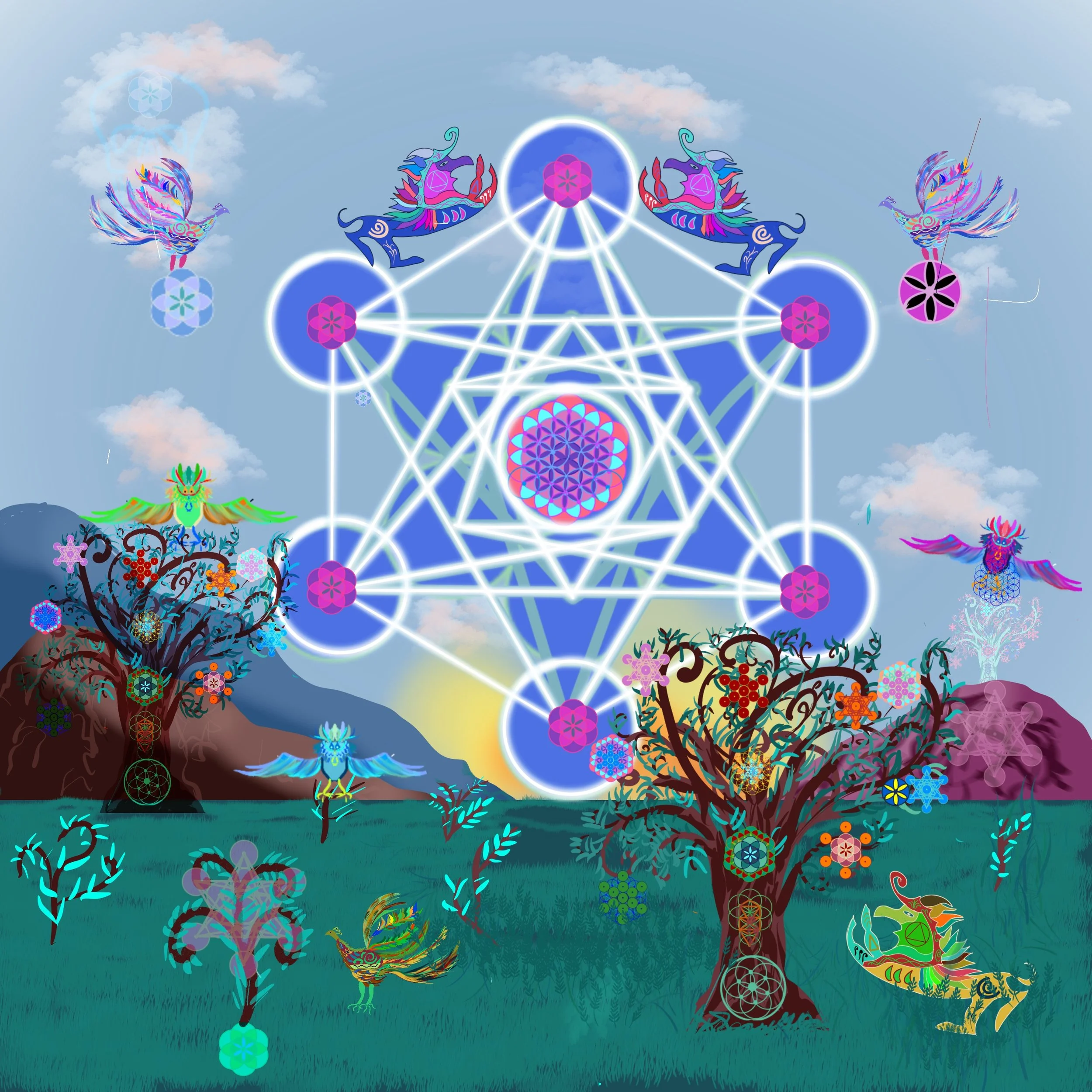 The Angel Metatron’s cube is central to the drawing. The Angel Metatron is the scribe of God. Metatron's Cube is a sacred geometric figure composed of 13 circles with lines extending from the center of each circle to the center of the other 12 circles. It's named after the archangel Metatron, who is often associated with spiritual transformation and divine communication. The cube represents the interconnectedness of all things in the universe, as well as the fundamental shapes and patterns found in creation. It's believed to hold the keys to understanding the structure of the universe and serves as a symbol of protection, balance, and harmony.