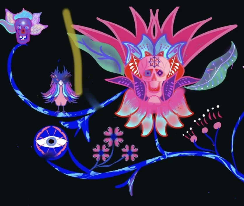from the mortality of the skull. There are multiple flower skulls to represent the multiple cycles of birth, death and rebirth.