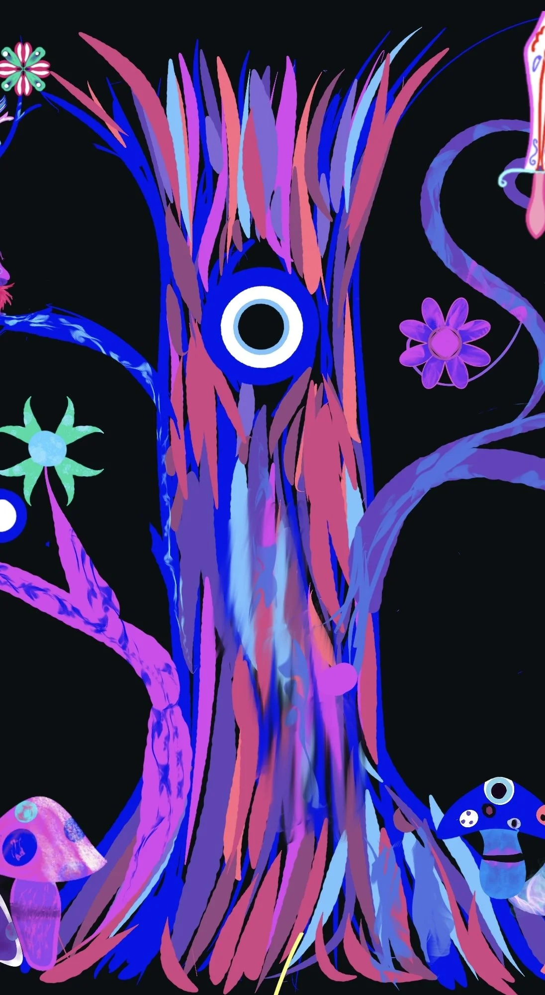 Behind the tree are the lights of the city. This represents perceived human reality. In the building are the people trying to exist in this world. The tree in the foreground is full of magical creatures. It is drawn in colors that represent its invisibility to normal human perception.